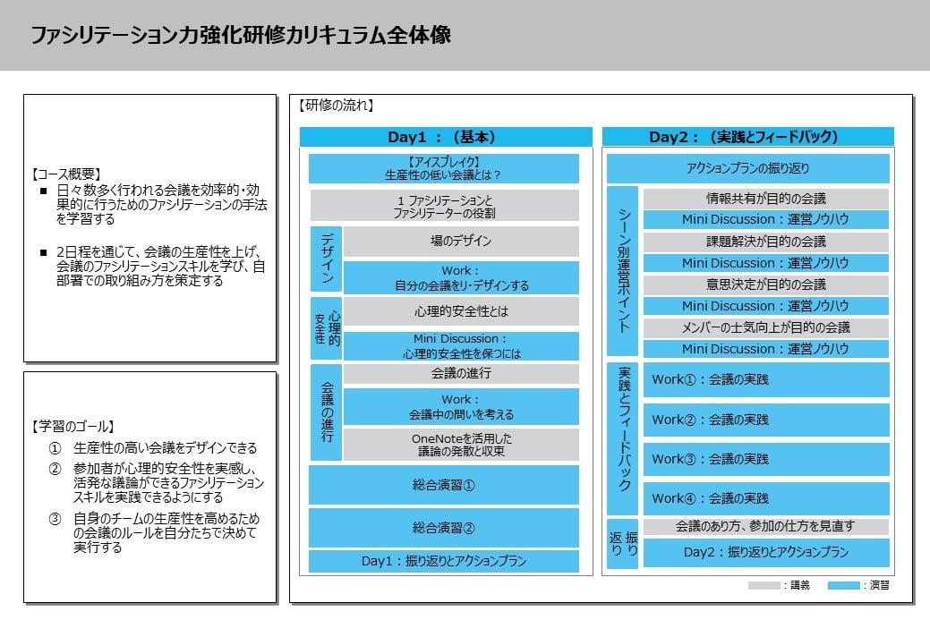 菅原様:「コミュニケーションの質と量を向上する」ための施策として実施しておりますが、他にも人事トップがファシリテーションスキルを強化への強い思いを持っており、また現場からのニーズも多いことから実施することとなりました。